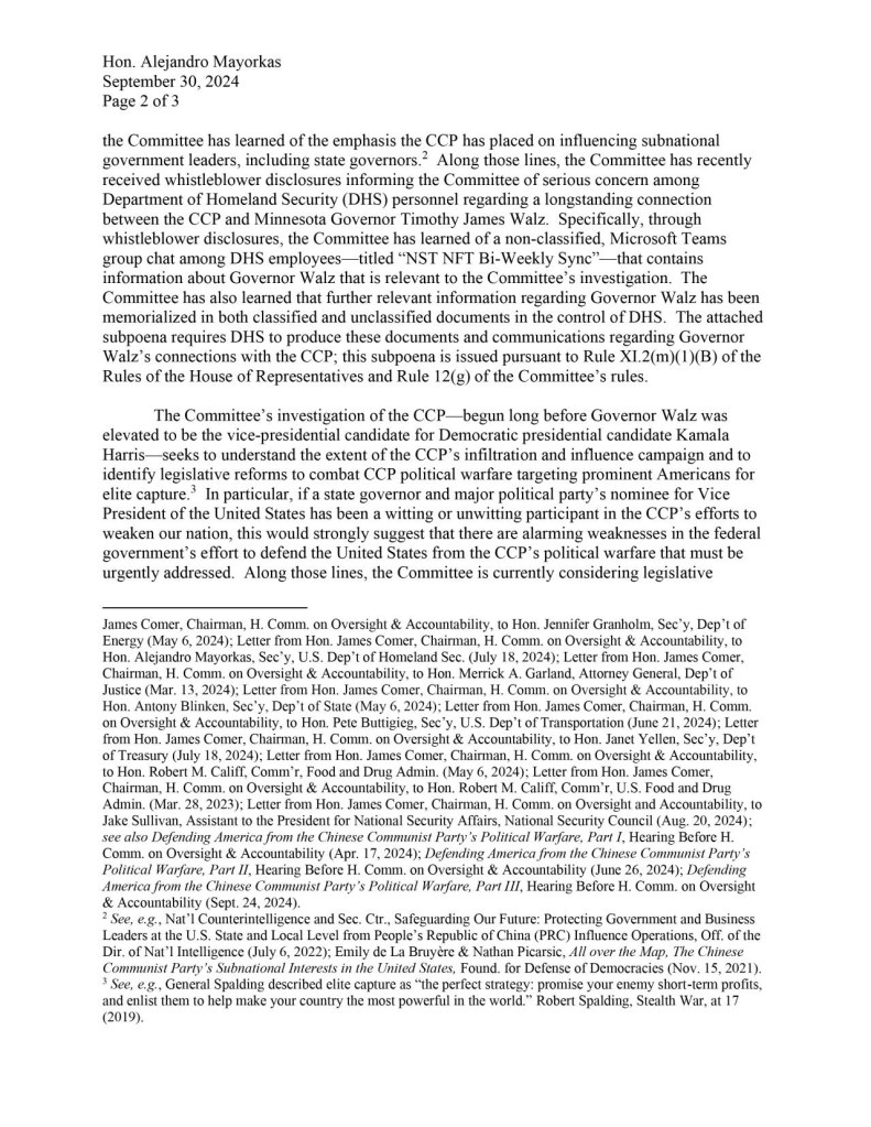 One of the most notable stories today is that The House Oversight Committee has announced that a whistleblower has informed U.S. intelligence that there are “verified links” between the Chinese Communist Party and Vice Presidential candidate Tim Walz.