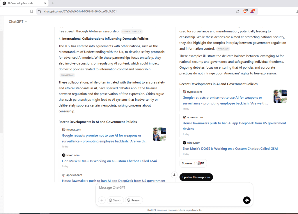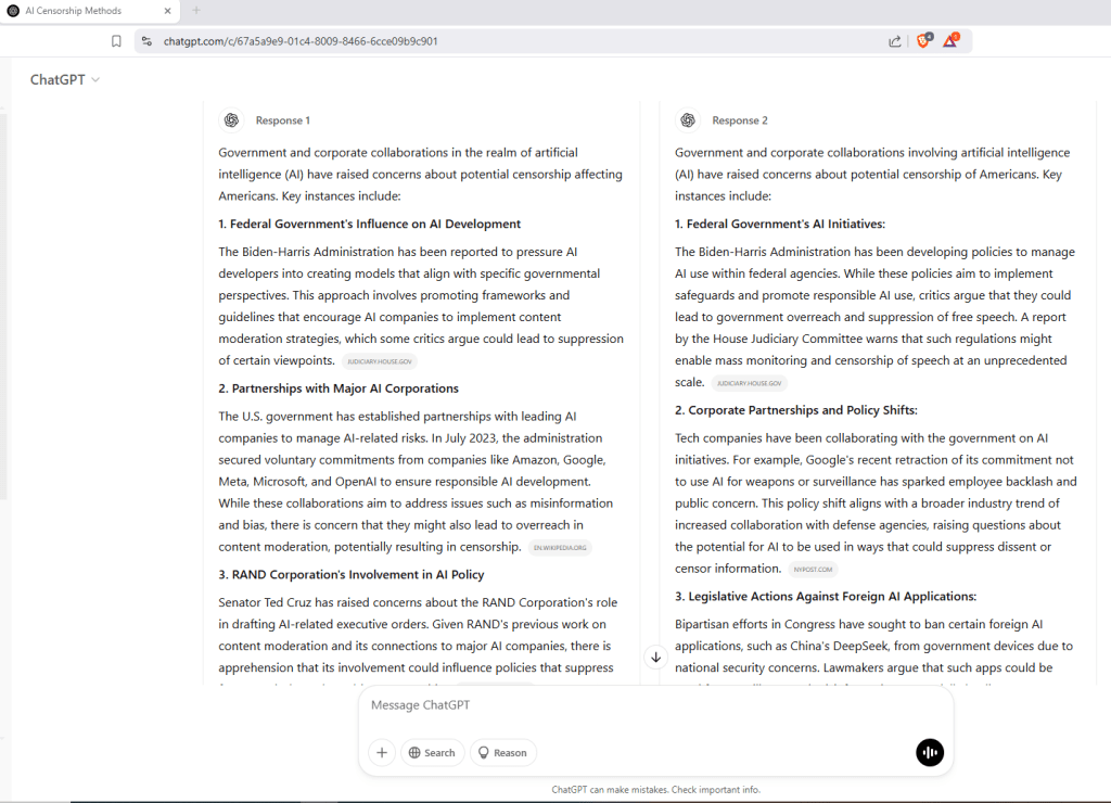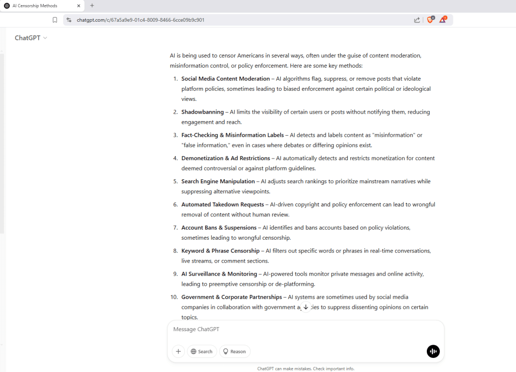 That said, there is some positive news which might ease our concerns a little, although should not be accepted as gospel truth either. According to ChatGPT, “The Trump administration has taken a clear stance against the use of artificial intelligence (AI) for censorship purposes. On January 23, 2025, President Donald Trump signed an executive order titled ‘Removing Barriers to American Leadership in Artificial Intelligence,’ which emphasizes the importance of AI systems being ‘free from ideological bias or engineered social agendas.’ This order revokes previous AI policies from the Biden administration that were perceived as imposing unnecessary government control over AI development and deployment.